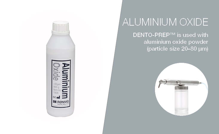 DENTO-PREP™ is used with aluminium oxide powder (20–80 µm) and can be applied both intra- and extraorally. For intraoral use, a rubber dam is recommended to protect soft tissue.