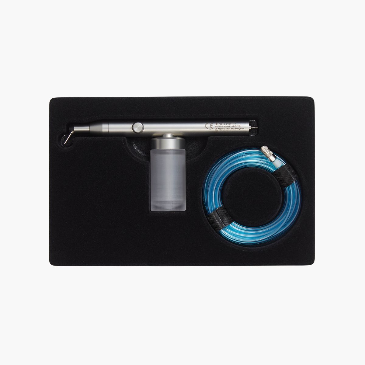 It is used with Aluminum Oxide powder and is applicable for both extra- and intraoral procedures.